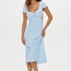 Delicate midi dress lives up to its name with feminine charm and thoughtful construction. Fluttery flounce sleeves add movement, while a keyhole at the back is secured with a row of functional buttons.