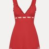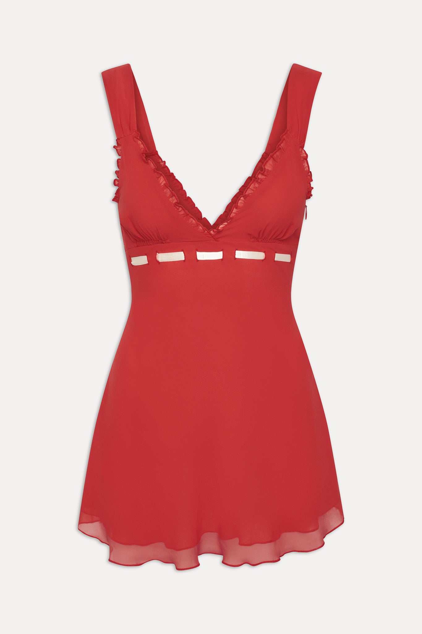 Dreamer mini dress is made from airy chiffon. A ruffled neckline frames the bust with just the right amount of charm, while a satin ribbon threads through delicate buttonhole details.