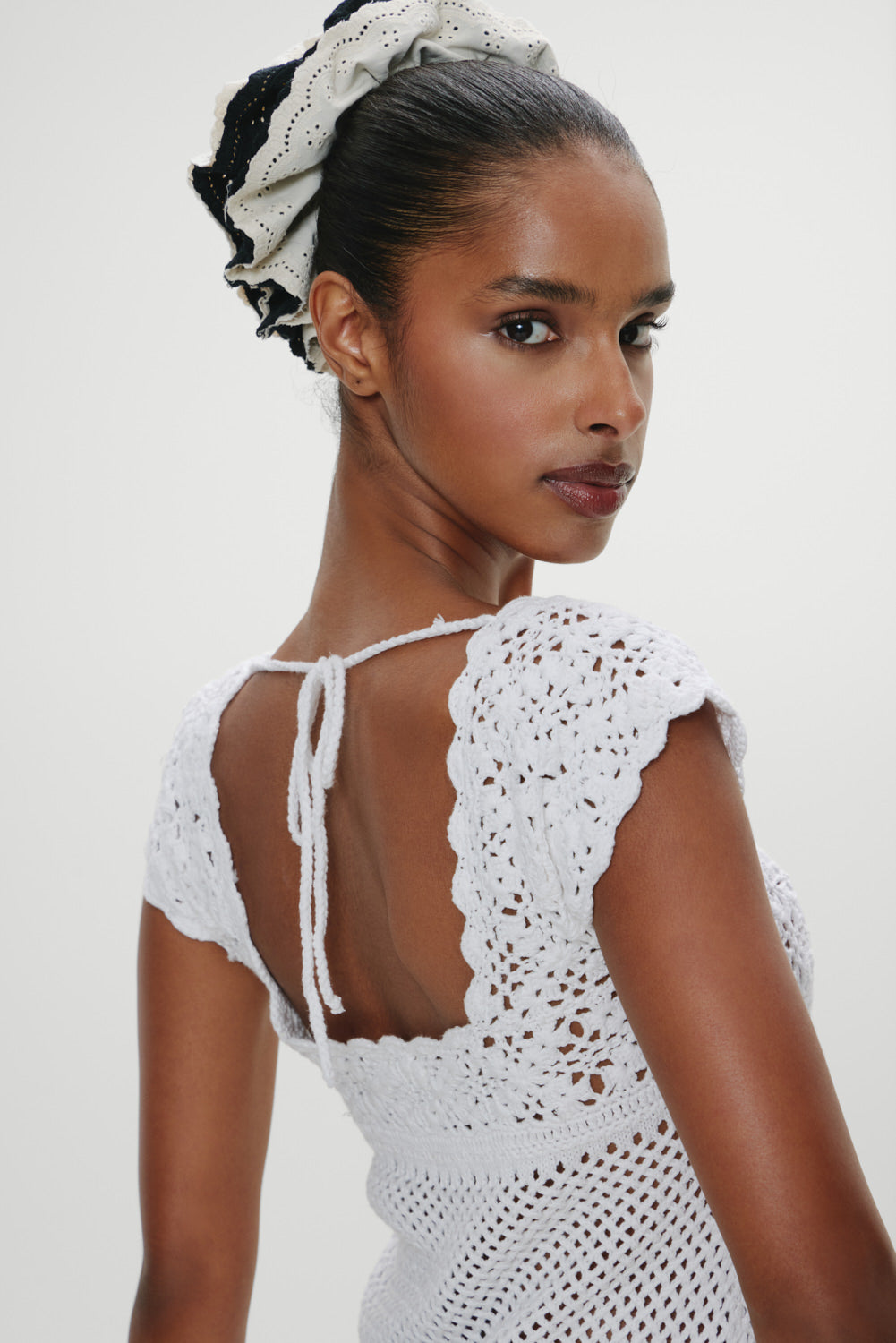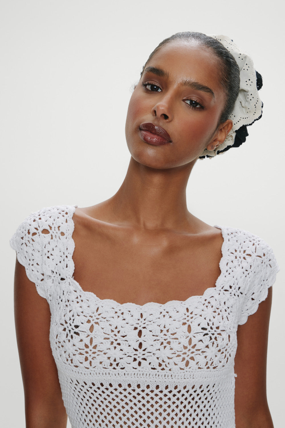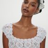 - Floral crochet detailing at bust and sleeves