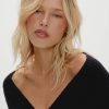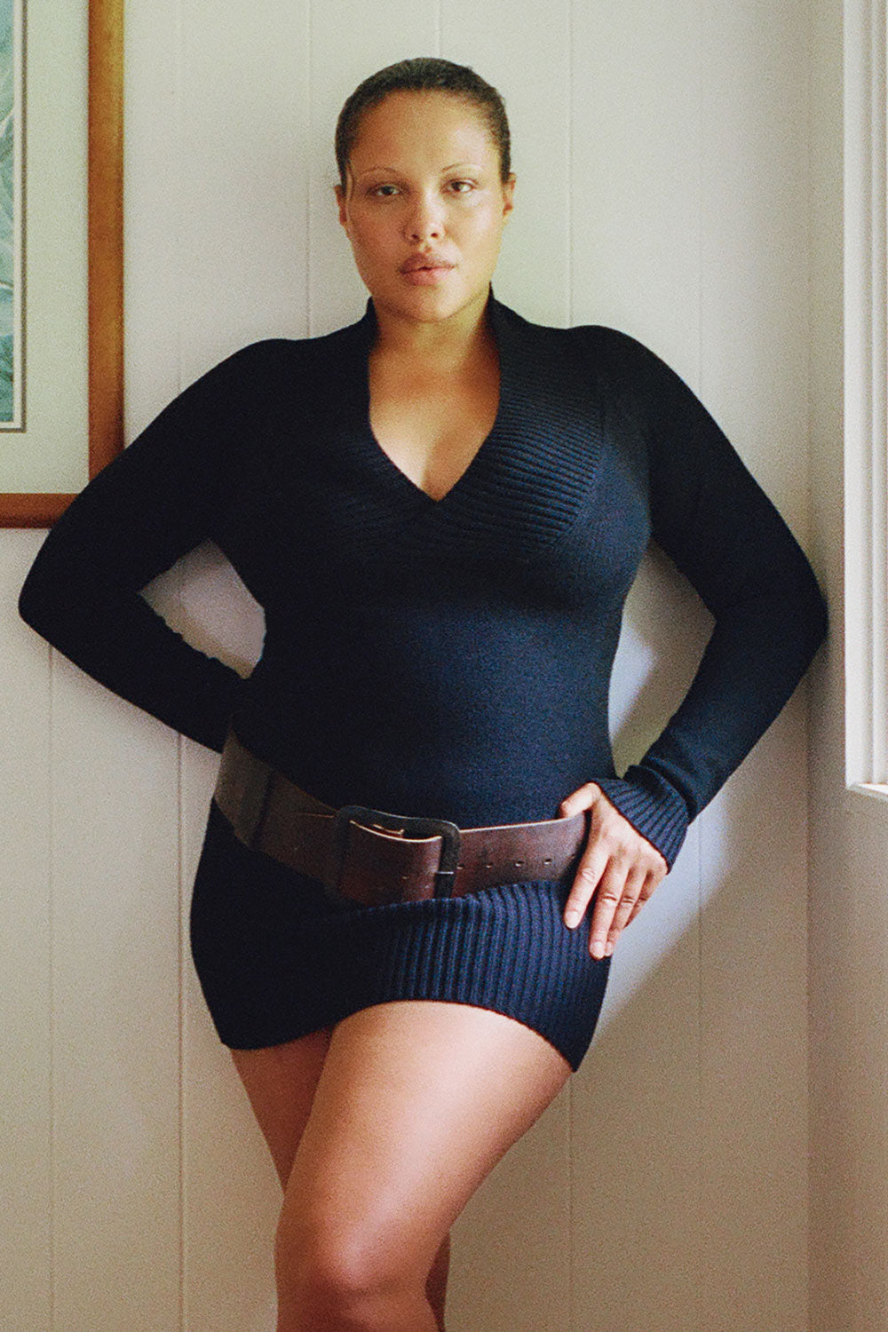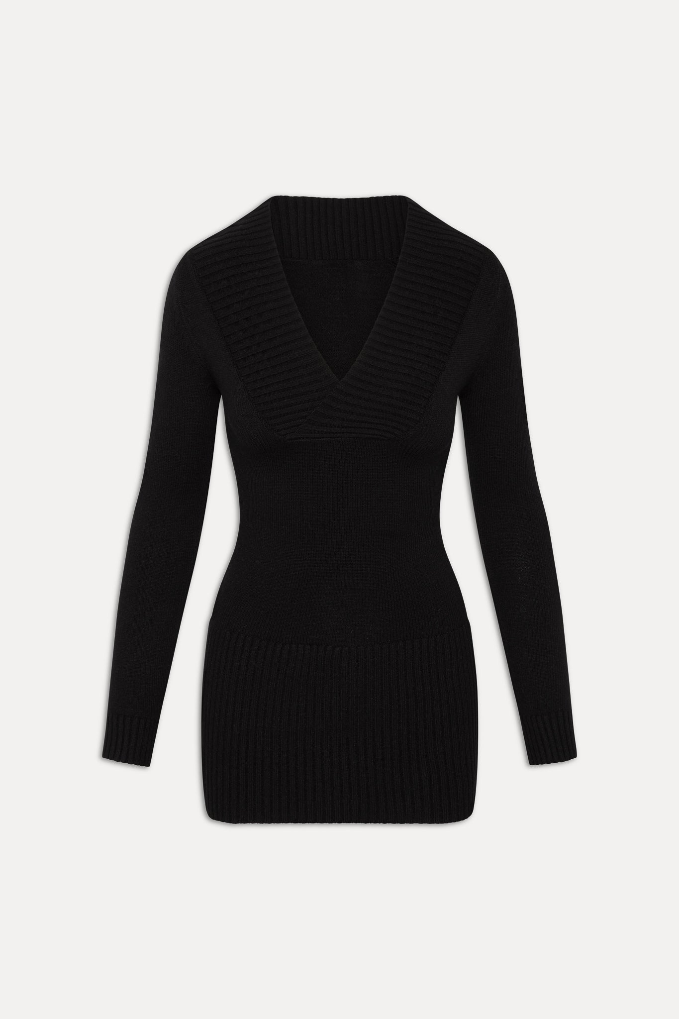 Jade dress is a Cloud Knit mini with a v-neckline and exaggerated long sleeves.