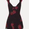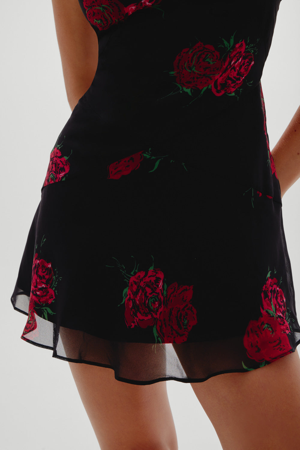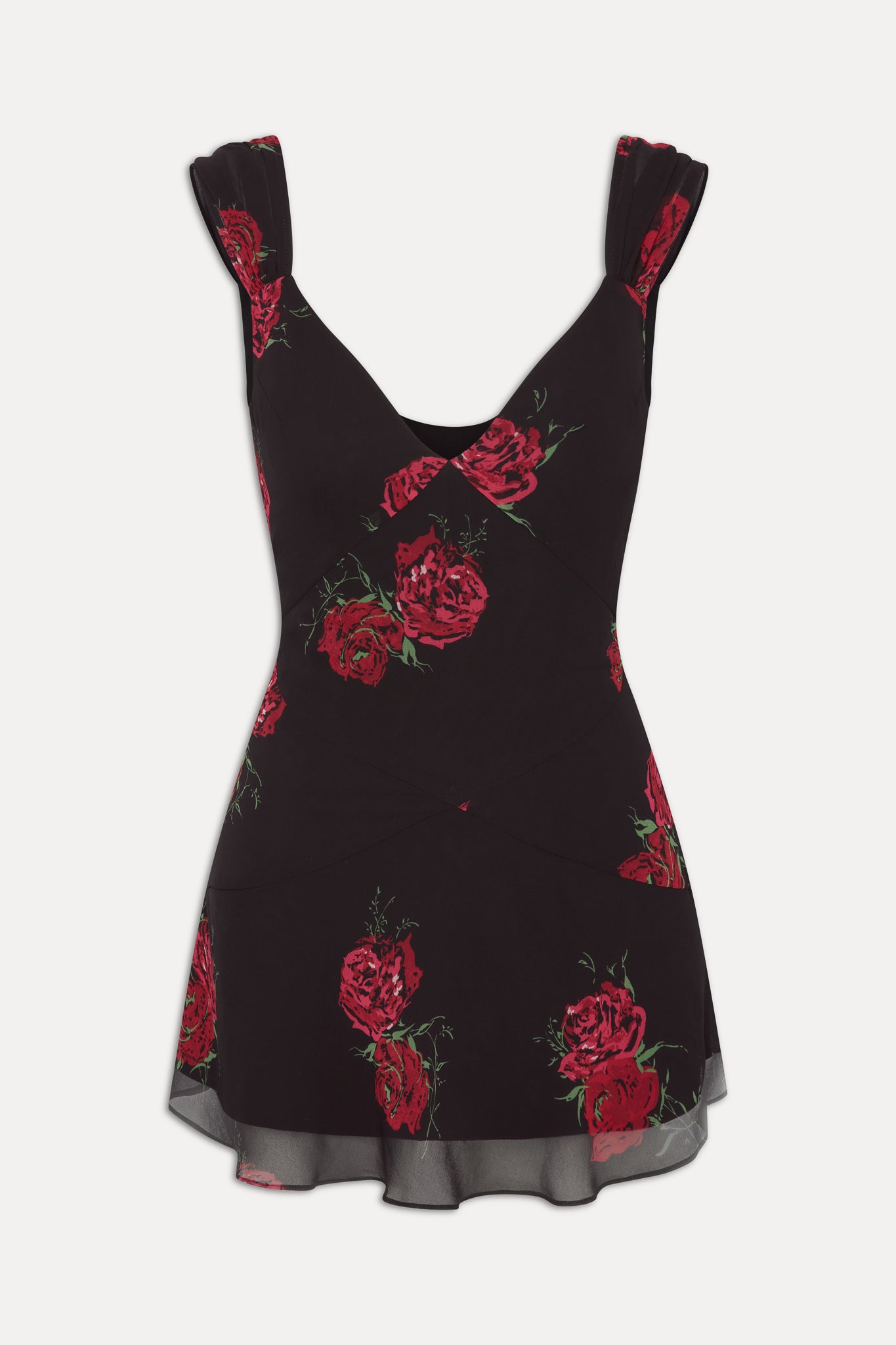 Lunarose mini dress is crafted from airy chiffon and adorned with a new floral pattern. This silhouette is fully lined and features flutter sleeves that drape delicately over the arms for an ethereal effect.