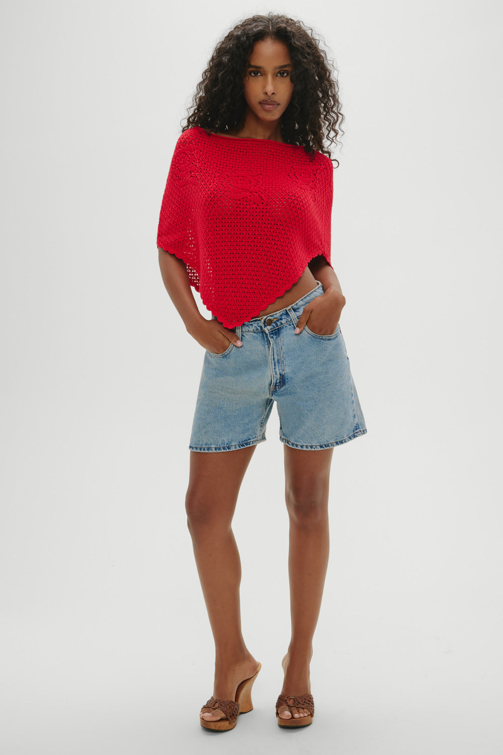 Sophie poncho is designed with a see-through crochet weave. It’s the perfect layer to throw over blue jeans for a day on the ranch.