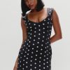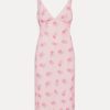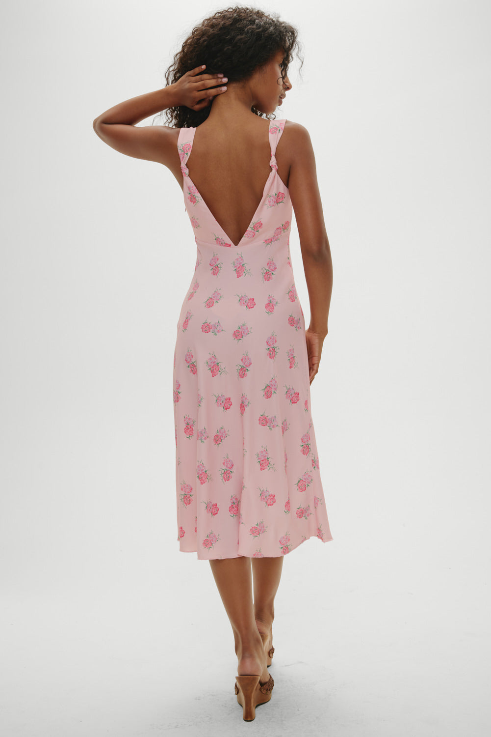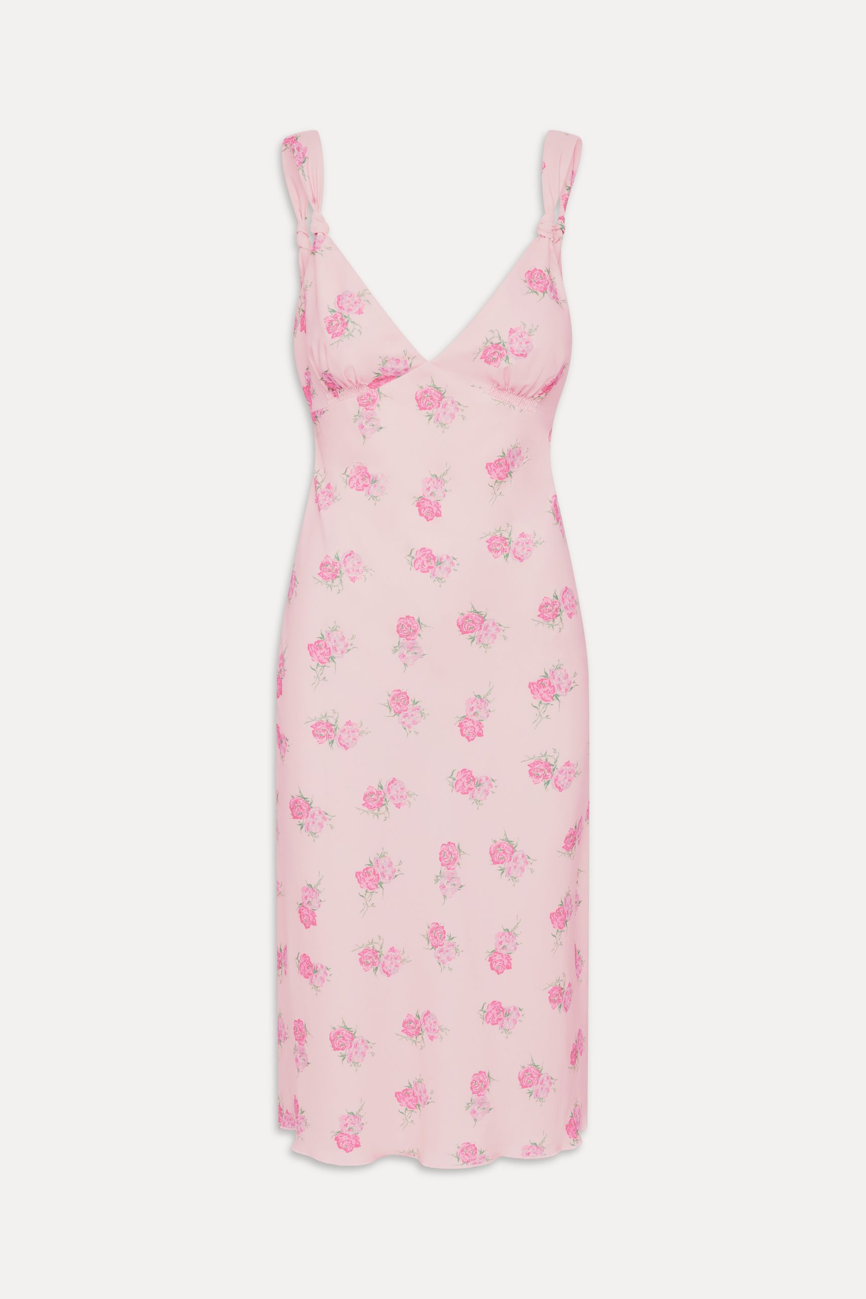 Gem dress is your newest summer slip. This midi features knotted straps, a flattering v-neckline, and a slim silhouette through the waist that flows into a floaty skirt.