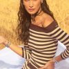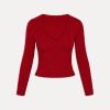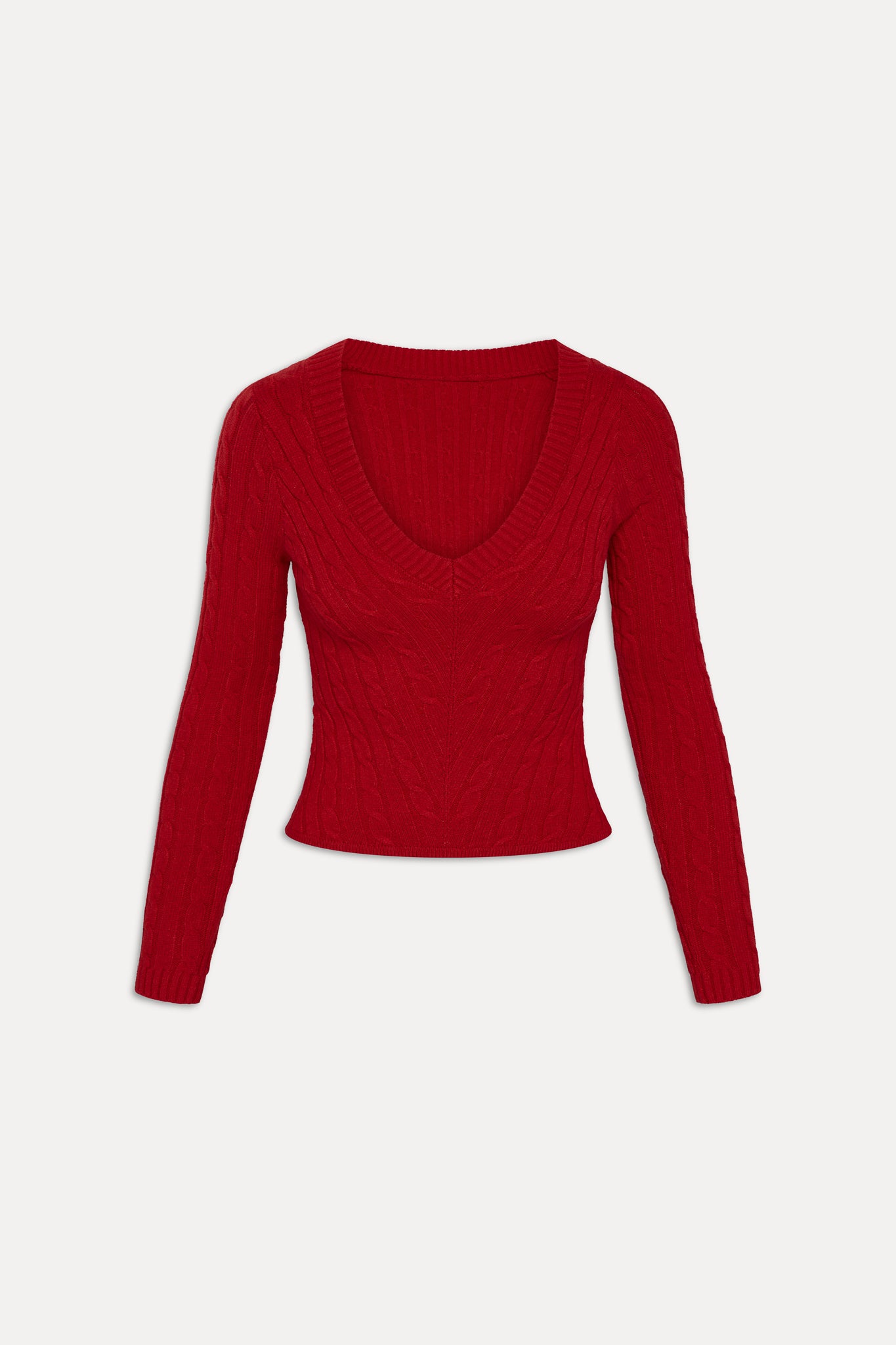 Kit sweater hugs the body with a tailored shape and a low v-neckline. The cable knit design falls into a v detail.